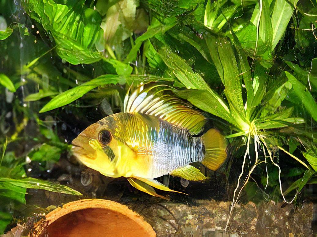 The Apistogramma will thrive in an aquarium with a sandy substrate and plenty of refuge such as clay pots, driftwood, and rock formations. It is an excellent candidate for the planted aquarium, but it also needs a fair amount of open space. This cichlid is generally compatible with other peaceful fish as long as it has plenty of space. Territoriality is typically at its peak during spawning. Dwarf shrimp and other small, delicate invertebrates should not be kept with the Apistogramma Dwarf Cichlid, but more durable, larger shrimp and snails COULD possibly make good tankmates in a large enough aquarium. If spawning is desired, tank mates of other species should be kept to a minimum or avoided altogether.
