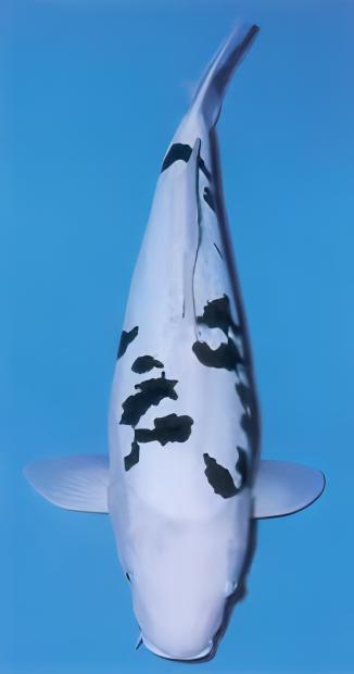 Along with having a great shape and bright blemish-free skin, the Bekko should have a series of dark, distinctive, sparsely distributed Sumi markings on its body. The dense black markings should make a simple pattern. They need not be symmetrical, but should be balanced from front to back. Bold, solid spots of Sumi are preferred over tiny dots that look like paint splatters or freckles. Just like Sanke, a large patch of Sumi on the shoulder region is a desired feature. Additionally, the Sumi should appear only on the koi’s back above the lateral line, and preferably ending well before the tail joint. Too much Sumi on the caudal peduncle will make the koi appear very off balanced.
