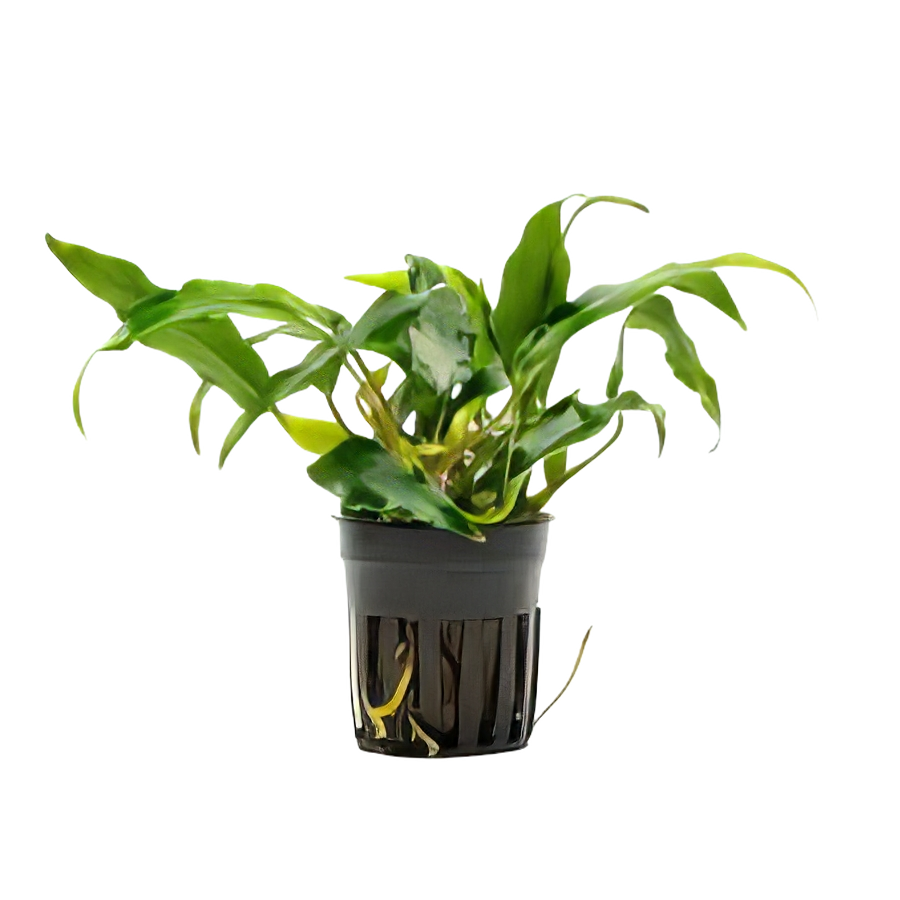 A hardy and easy-care aquarium plant, Five Potted Plants Narrowleaf Glabra Anubias Plant Anubias Minima is supplied pre-attached to natural driftwood for instant placement. Its lush green leaves create a natural look while providing excellent shelter for fish and shrimp. Ideal for low-maintenance and low-tech aquariums.