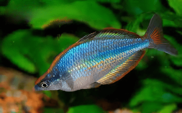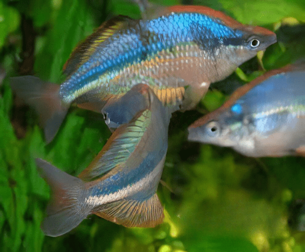 Peaceful, active fish. Rainbowfish are generally hardy and easy to care for. Rainbowfish are truly unique in that the males of most species have a bright iridescent strip running from the top of the mouth up over the ridge of the back and continuing to the dorsal fin. Males frequently “flash” this bright strip on-and-off in absolutely stunning displays. When they flash, it looks like a neon light is being turned on and off. This, combined with the amazing coloration of many species, is something truly special that is not to be missed. Fortunately, these fish display and flash frequently.