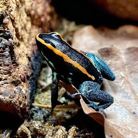 Overview: The Golfodulcean Poison Frog, known for its striking appearance and vibrant colors, is a captivating addition to any vivarium. Originating from the lush rainforests of Costa Rica and Panama, these small-sized frogs boast a mix of black and bright yellow stripes along their sleek bodies, making them an eye-catching display species.