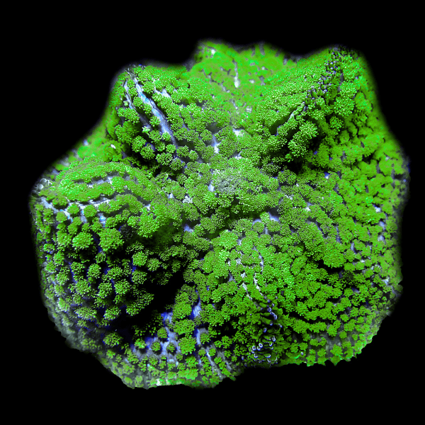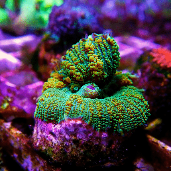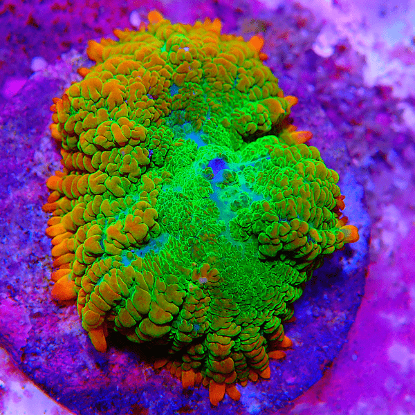 Mushroom Corals from the Rhodactis genus are known for their unique, textured appearance and brilliant colors, ranging from shades of green, blue, and purple to more exotic blends. They are soft corals that can grow into large, fleshy colonies, adding a lush, organic look to your reef tank. Easy to care for and fast-growing, these corals are ideal for filling in spaces within your reefscape.
