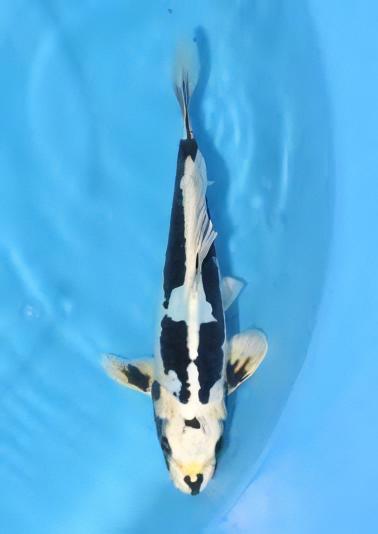 Essentially, this first Kumonryu koi, and any subsequent Kumonryu, are Doitsu versions of the Yatsushiro koi. A Doitsu koi is a koi that has no scales except for a line of large scales along the lateral line of the fish (where the dorsal fin runs) and one line along either side of the dorsal fin. So, a Kumonryu koi is a scaleless koi with a shiro (white) base colour and a sumi (black) pattern on top.