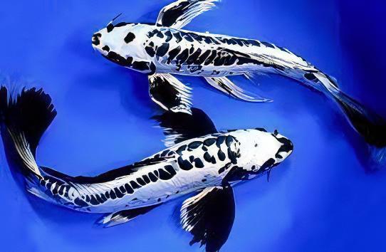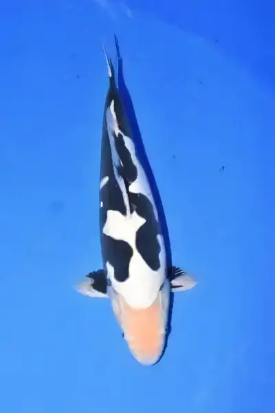 Some koi keepers might ask, “so, what is the difference between a Kumonryu and a Doitsu Shiro Utsuri?” A Doitsu Shiro Utsuri is also a black and white scaleless fish but if you look carefully, you can see some differences. As mentioned above, one of the parent varieties of the Kumonryu koi is the Shusui koi which has a blue base colour to the body of the fish. Therefore, if you look closely at the white of the fish, a Kumonryu will have a slight blue tinge to the white while a Doitsu Shiro Utsuri will have a pure snow-white base colour. In addition, the sumi pattern of the fish will appear to run down the length of the koi on a Kumonryu while, on a Doitsu Shiro Utsuri, the sumi pattern will appear to wrap around the body of the fish. These differences can be very hard to spot as the two fish are very similar indeed!
