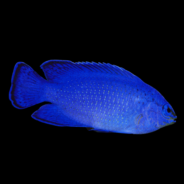 Overview: The Malaysian Electric Blue Damsel, known for its vibrant azure hue, is a striking addition to any marine aquarium. This small, yet vividly colored fish, adds a dash of brilliance to the underwater world it inhabits. It is admired not only for its beauty but also for its hardiness, making it a popular choice among aquarists.