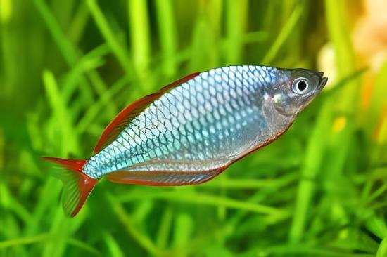 A large shoal of iridescent Neon Rainbowfish gracing a planted community aquarium creates a wonderful, eye-catching display. Best maintained in groups of at least 6 specimens, they will add activity and colour to the top and middle levels of the tank. The aquarium itself should be 3ft in length, or longer. The sides and back should be aquascaped with plants and bogwood to create a network of hiding places which the fish will enjoy exploring, leaving a large open swimming space in the central portion. Floating plant species can be used to help diffuse bright lighting. Perfectly peaceful with other species and will not eat plants; an ideal community aquarium candidate! Do not keep with large boisterous species. May also be seen on sale as Neon Dwarf Rainbowfish or Praecox Rainbowfish.