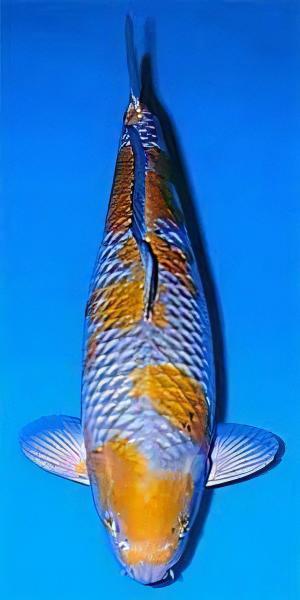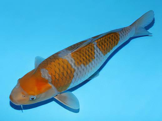 The Ochiba koi was first bred in the mid-90s from a pairing of a Chagoi koi (a light brown koi that is very similar to a wild carp) and a Soragoi koi (a grey-blue single-coloured koi). The result was a koi with the grey-blue colour of the Soragoi, overlaid with a pattern in the colour of the brown of the Chagoi. Over the following years, the variety has been developed to develop the brown markings into a more bronze or orange colour, with both colours being very popular in the variety today.