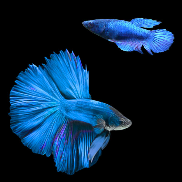A matched male and female Betta intended for experienced keepers or breeding projects. Bettas are territorial, so provide dense cover and be prepared to separate the pair if chasing or stress occurs. This variety is known for wide delta-style tail.